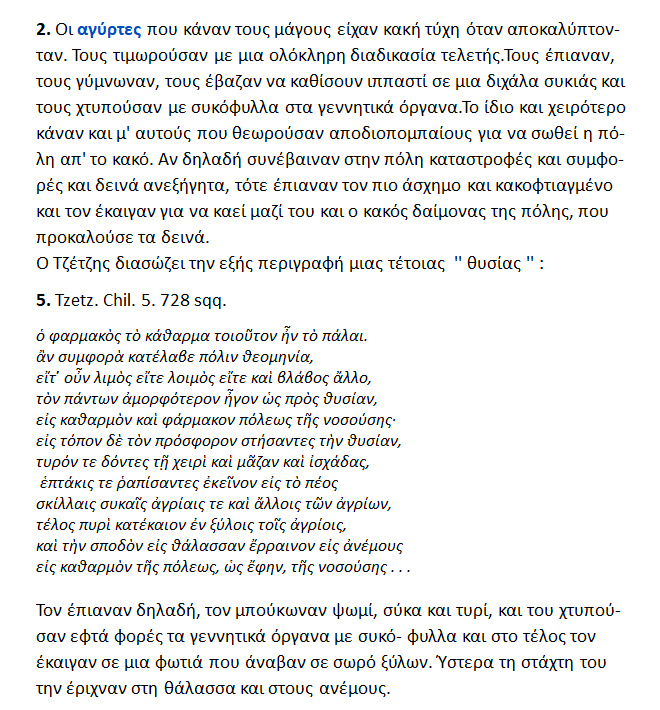Η Τιμωρία των αγυρτών. α].Πώς τιμωρούσαν τους αγύρτες , ψευτομάγους ; Τους γύμνωναν ,τους έβαζαν να καθίσουν ιππαστί σε μια διχάλα συκιάς και τους χτυπούσαν με συκόφυλλα στα γεννητικά όργανα. Η Τιμωρία των αποδιοπομπαίων. β].Πώς τιμωρούσαν τους αποδιοπομπαίους , για να σωθεί η πόλη από το κακό ; Έπιαναν ως αποδιοπομπαίο τον πιο άσχημο και κακοφτιαγμένο και αφού τον μπούκωναν ψωμί , τυρί και σύκα τον χτυπούσαν εφτά φορές στα αχαμνά . Τέλος τον έκαιγαν σε φωτιά από ξύλα άγρια –για να καεί μαζί του η κακοδαιμονία της πόλεως – και έριχναν την τέφρα του στη θάλασσα. Πώς ξέρει τόσες λεπτομέρειες ο Ι.Τζέτζης μετά από τόσους αιώνες ; Έχει αδιάσειστα στοιχεία και ατράνταχτα ντοκουμέντα ; Δυστυχώς στηρίζει την θεωρία του στον σκωπτικό ποιητή Ιππώνακτα !! Παίρνει στα σοβαρά δηλαδή τα σκωπτικά του ποιητή ,αφού προσθέσει κι αυτός το κάτι τι : την καύση των Φαρμακών δλδ. των πιο αμόρφων, ασχήμων , αναπήρων της πόλεως !! Πουθενά όμως ο Ιππώνακτας δεν κάνει λόγο για καύση των Φαρμακών.