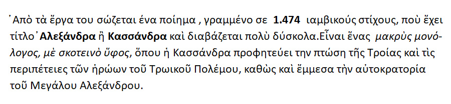 ΛΥΚΟΦΡΩΝ ο Χαλκιδεύς – » Κασσάνδρα ή Αλεξάνδρεια ».Ποίημα γραμμένο σε 1.474 ιαμβικούς στίχους .Μακρύς μονόλογος της Κασσάνδρας , που προφητεύει την πτώση της Τροίας , σε σκοτεινό ύφος.