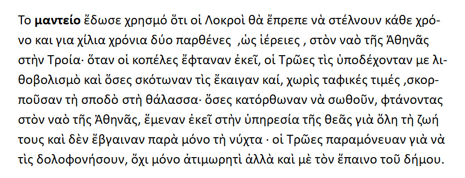 Oι Λοκροί μετά από χρησμό του μαντείου των Δελφών, έστελναν δύο παρθένες ως ιέρειες στο ναό της Αθηνάς στην Τροία. Όταν οι παρθένες έφταναν εκεί οι Τρώες τις λιθοβολούσαν . Όσες σκότωναν δε , τις έκαιγαν χωρίς ταφικές τιμές [ ακτέριστος και άταφος ] και μετά σκορπούσαν τη σποδό στη θάλασσα.