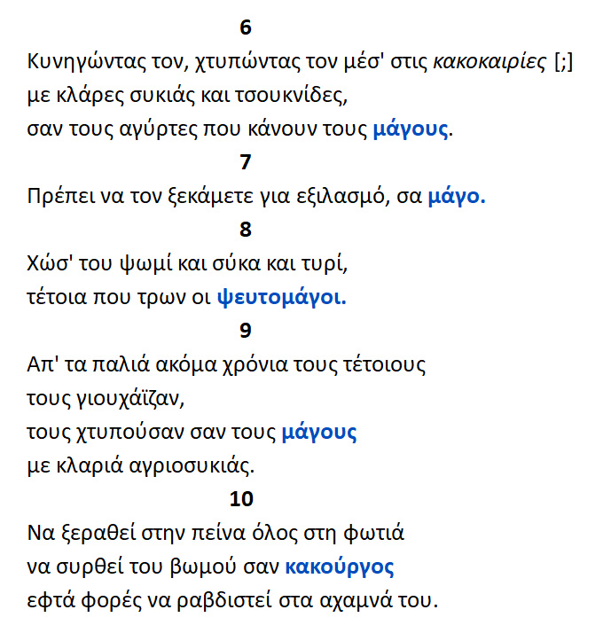 Ο Ιωάννης Τζέτζης { 12ος αι. μ.Χ. } αναπαράγει τα ίδια με το Λεξικό του Σούδα [ 10ος αι.μ.χ. } : Φαρμακός = κάθαρμα. Είναι απορίας άξιον , πώς ο Ι.Τζέτζης εκλαμβάνει τοις μετρητοίς όσα γράφει ο σατυρικός ποιητής Ιππώναξ για την τιμωρία των αγυρτών -μάγων { αν έχουν στοιχεία αλήθειας } και τα αναφέρει ως τεκμήριο. Όμως ,όπως ο Αριστοφάνης έτσι και ο Ιππώναξ ,είναι ποιητές της κωμωδίας και της Σάτυρας .Ως εκ τούτου δεν λαμβάνεται η ποίησή τους ως ιστορική απόδειξη αλλά σαν κωμικά δρώμενα με σκοπό το γέλιο . Οι ιστοριογράφοι έχουν αυτό το προνόμιο , γιατί ως ειδήμονες αναζητούν τα αίτια και την αλήθεια των παραδόσεων.