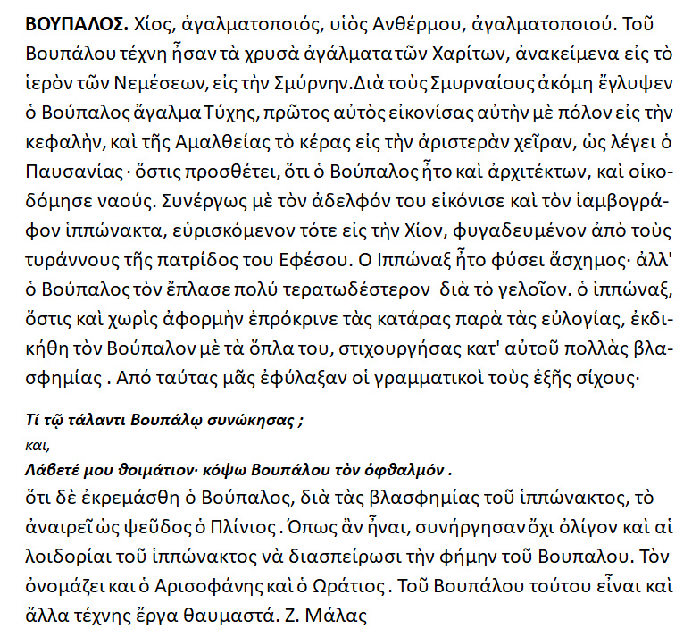 Ο Βούπαλος , ήταν γλύπτης και έπλασε τον Ιππώνακτα , εκ φύσεως άσχημος , πολύ τερατωδέστερον ,δια το γελοίον .Ο Ιππώναξ τότε τον εκδικήθηκε με τους καυστικούς και βλάσφημους στίχους του .