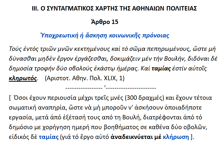 Ατόπημα μέγα ! Στην Κλασσική Αθήνα , όχι μόνο δεν τιμωρούσαν τους αναπήρους [ κάνοντάς τους αποδιοπομπαίους φαρμακούς ] αλλά τουναντίον ήταν υποχρεωτική βάσει Συντάγματος της Αθηναίων πολιτείας η χορήγηση ημερησίου βοηθήματος.{ άρθρο 45 }.