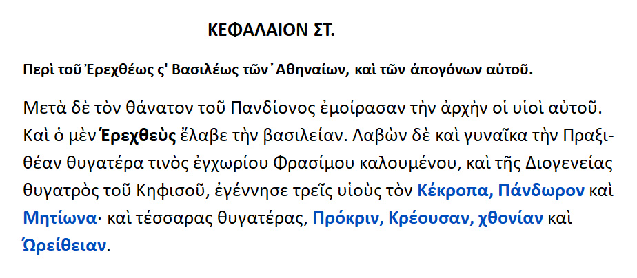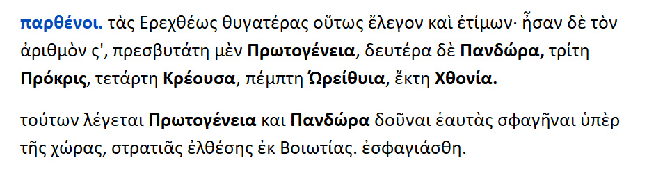 Ο Ερεχθεύς και οι [4] κόρες του. Δεν αναφέρει ούτε την Πρωτογένεια , ούτε την Πανδώρα.! [Το αυτό γράφει και ο ΑΝ.ΚΩΝΣΤΑΝΤΙΝΙΔΗΣ – »Λεξικό κυρίων ονομάτων ».]