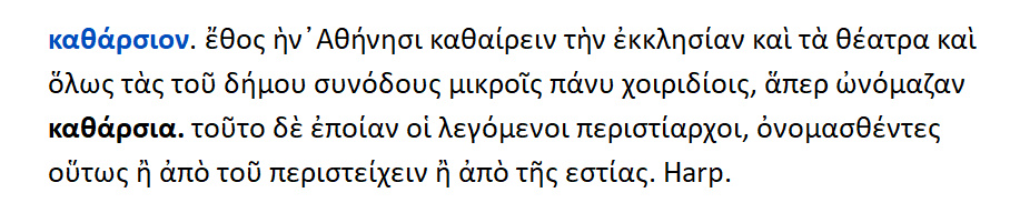 Οι Αθηναίοι έκαναν καθαρμούς στην πόλη τους με μικρά χοιρίδια , που τα ονόμαζαν καθάρσια. Αυτοί δε , που ποιούσαν τους καθαρμούς ονομάζονταν Περιεστίαρχοι { ή από του περιστείχειν ή από της εστίας }.
