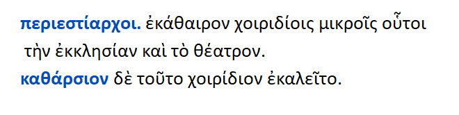 Περιεστίαρχοι. Αυτοί , που εκάθαιρον με μικρά χοιρίδια την εκκλησία [ του Δήμου ] και το θέατρο. Το δε χοιρίδιον καλούσαν καθάρσιον .
