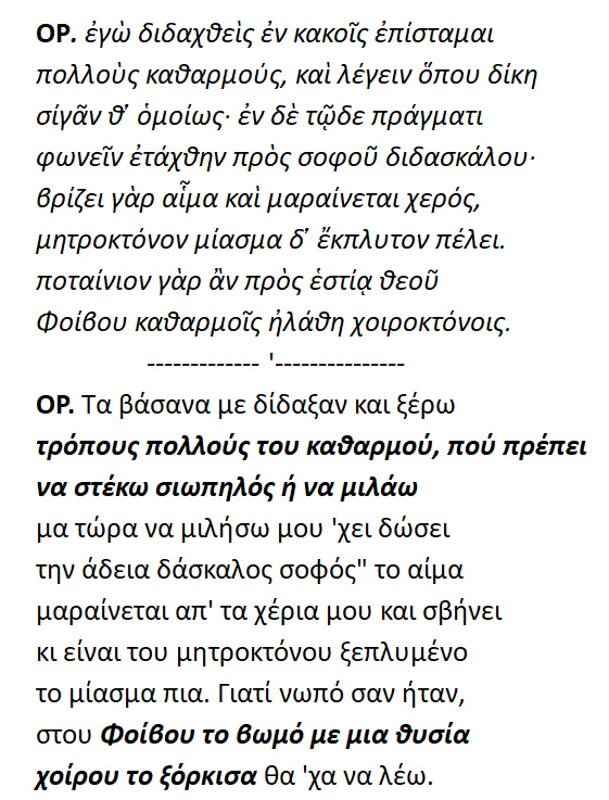 << στου Φοίβου [Απόλλωνος } το βωμό με μια θυσία χοίρου [ χοιροκτόνον ] το ξόρκισα [ καθάρισα ].
