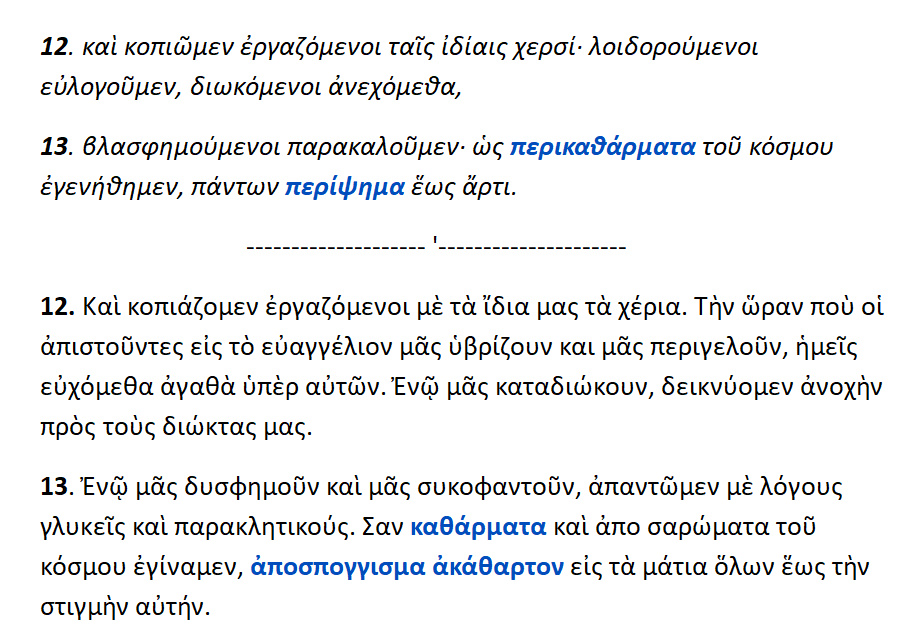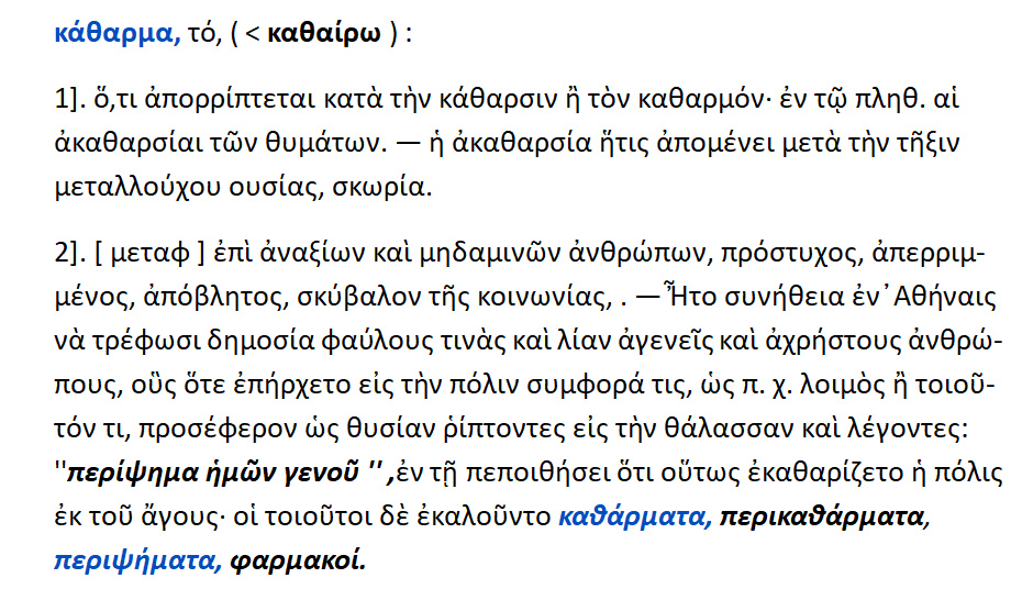Περικαθάρματα =καθάρματα,. Περίψημα = αποσπόγγισμα ακάθαρτον.
