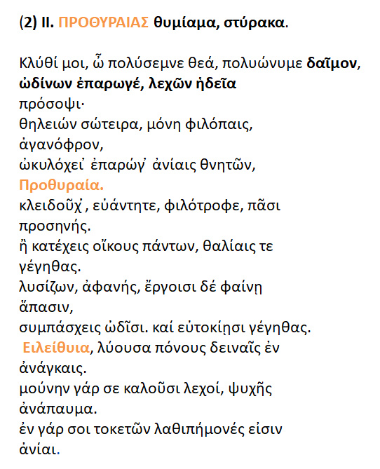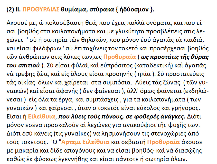 2. Προθυραίας θυμίαμα στύρακα . << Ειλείθυια , ωδίνων επαρωγέ , Προθυραία >> .