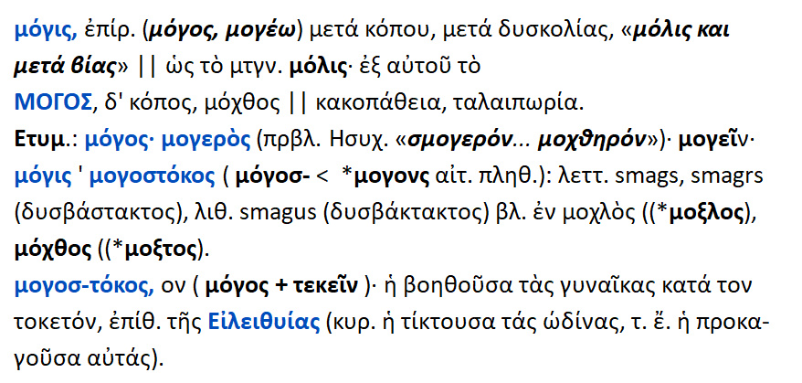 Μογοστόκος : μόγος + τεκείν {τόκος}. Η τίκτουσα τις ωδίνες ,η βοηθούσα τις γυναίκες στον τοκετό .