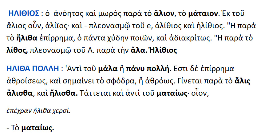 Ηλίθιος παρά το άλιον =το μάταιον ή παρά το λίθος ή παρά την άλα .
