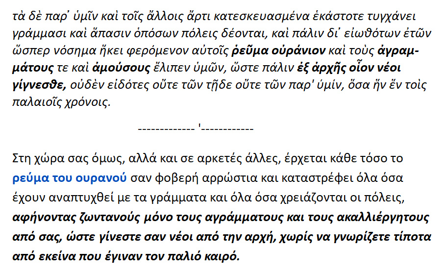<< Μετά από μεγάλες φυσικές καταστροφές , όπως ο κατακλυσμός μένουν ζωντανοί μόνο οι αγράμματοι και οι ακαλλιέργητοι ,ώστε γίνεστε σαν νέοι από την αρχή , χωρίς να γνωρίζετε αυτά που έγιναν τον παλαιό καιρό.>.