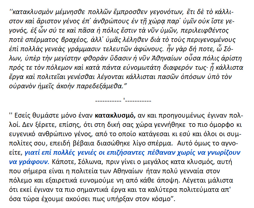 << Εσείς θυμάστε μόνον ένα κατακλυσμό αν και έχουν γίνει πολλοί στο παρελθόν. Στην δική σας χώρα γεννήθηκε το πιο όμορφο κι ευγενικό ανθρώπινο γένος. Αυτό όμως το αγνοείτε γιατί επί πολλές γενιές οι επιζήσαντες πέθαναν χωρίς να γνωρίζουν να γράφουν.>>