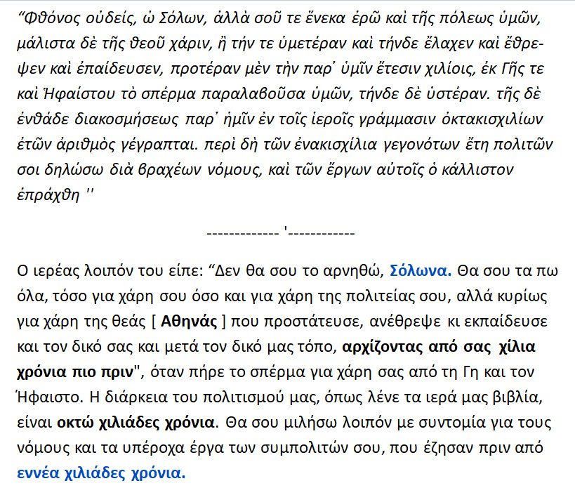 ΙΕΡΕΑΣ : << Η διάρκεια του πολιτισμού μας -όπως λένε τα ιερά μας βιβλία- είναι οκτώ χιλιάδες χρόνια { 8.000 } .Θα σου μιλήσω για τους νόμους και τα υπέροχα έργα των συμπολιτών σου , που έζησαν πριν από εννέα χιλιάδες χρόνια { 9.000} >>.!