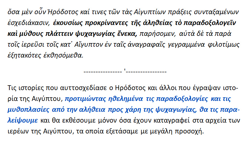 << Τις ιστορίες που αυτοσχεδίασε ο Ηρόδοτος και άλλοι που έγραψαν ιστορία της Αιγύπτου , προτιμώντας ηθελημένα τις παραδοξολογίες και τις μυθοπλασίες από την αλήθεια θα τις παραλείψουμε …>>