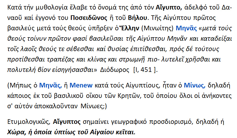 Ο Αίγυπτος ήταν αδελφός του Δαναού και εγγονός του Ποσειδώνος .Ο Έλληνας Μηνάς ήταν ο πρώτος βασιλεύς, μετά τους θεούς. Αίγυπτος σημαίνει η Χώρα που κείται υπτίως του Αιγαίου.