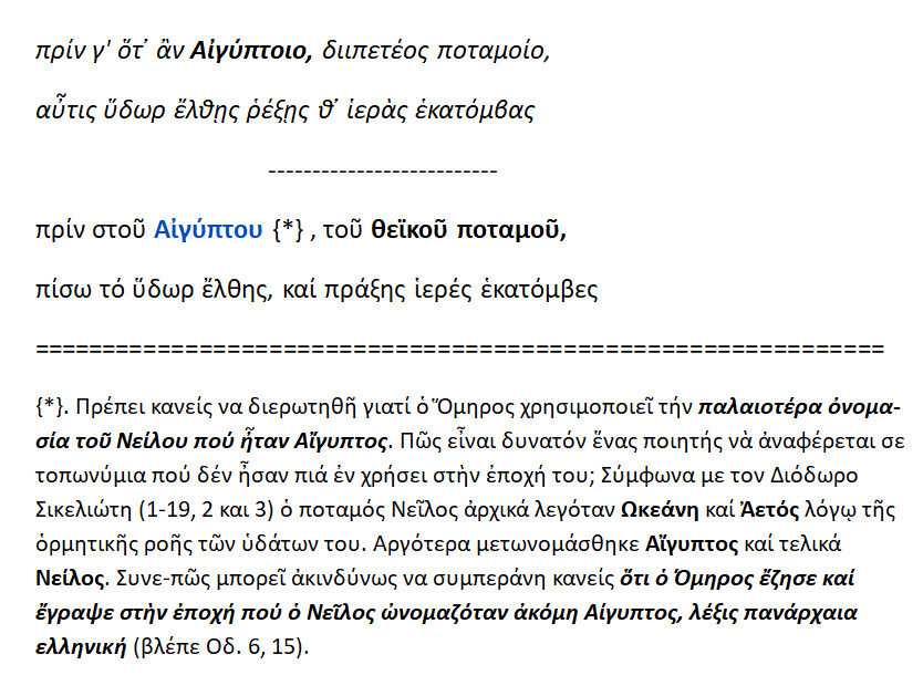 Αίγυπτος = Νείλος .Εύστοχη η ερώτηση του Ομηριστή Κ.Δούκα. Γιατί ο Όμηρος χρησιμοποιεί την παλαιότερη ονομασία του ποταμού Νείλου ; Διότι ο ‘Ομηρος έζησε σε πολύ παλαιά εποχή , όταν ο Νείλος ονομαζόταν ακόμη Αίγυπτος.! Ο θαυμάσιος ερευνητής θέτει θέμα επαναχρονολογήσεως της Ομηρικής εποχής , του Τρω’ι’κού πολέμου , της γραφής κ.α