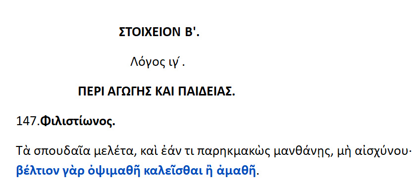 Ι.ΣΤΟΒΑΙΟΥ – » Ανθολόγιον ‘ , { Περί αγωγής και παιδείας , 147 . Προσθήκη }, σελ. 227 .
