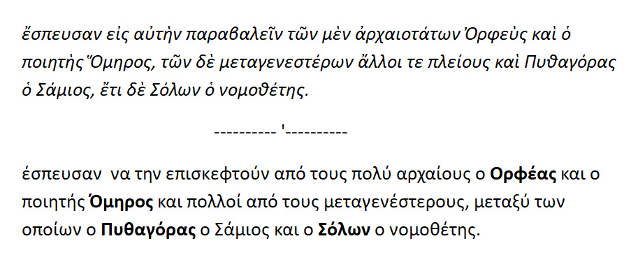 << Την Αίγυπτο έσπευσαν να επισκεφθούν από τους πολύ αρχαίους ο θεολόγος Ορφέας και ο ποιητής Όμηρος και από τους μεταγενέστερους ο Πυθαγόρας ο Σάμιος και ο Σόλων ο Αθηναίος. >>