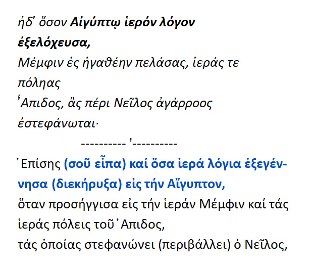 << ΟΡΦΕΑΣ : επίσης, σου είπα και όσα ιερά λόγια εξεγέννησα [=διεκήρυξα] στην Αίγυπτο. >> Ο Ορφέας δεν πήγε στην Αίγυπτο για να μυηθεί στα ιερά μυστήρια και στους ιερούς λόγους [ όπως ακρίτως διαδίδουν οι απαίδευτοι ] αλλά για να μυήσει, να διακηρύξει τον Θείο Ιερό Λόγο.