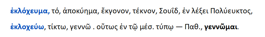 Εκλοχεύω = τίκτω , γεννώ. Εκλόχευμα =αποκύημα , έκγονον , τέκνον. { σήμερα έχει επιβιώσει στην γλώσσα μας η λεχώνα , η λοχεία και ο λόχιος πυρετός }.