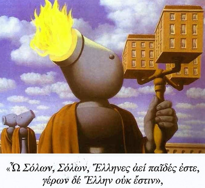 Ω Σόλων, Σόλων, Έλληνες αεί παίδές εστε, γέρων δε Έλλην ουκ έστιν >>. Τι σημαίνει κατά τον κ. Π.Τ. η φράση αυτή ; Ότι οι Έλληνες αγαπούν την έρευνα και ρωτούν συνέχεια γιατί , όπως τα παιδιά.! Συμπέρασμα : και στην κορφή κανέλα.! Τι ακριβώς θέλει να πει ο ποιητής -φιλόσοφος ; Διότι δεν είναι λογικό -άρα και αδύνατο – μια κοινωνία να απαρτίζεται μόνο από αιωνίους εφήβους . Φυσικά δεν έχει καμμία σχέση το » .φιλέρευνον πνεύμα των παιδιών » ,κατά Π.Τ , με αυτά που γράφει ο Πλάτωνας στον »Τίμαιο ». << Σόλωνα ,είστε αιωνίως παιδιά>> , είπε ο ιερέας. Τι σημαίνει αυτό; Σημαίνει ,ότι έχετε ξεχάσει την ιστορία σας [ λόγω του κατακλυσμού ]. Δεν σημαίνει ότι αγαπάτε την έρευνα σαν τα παιδιά.