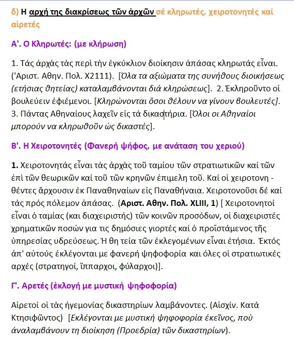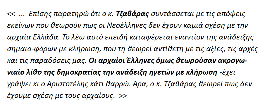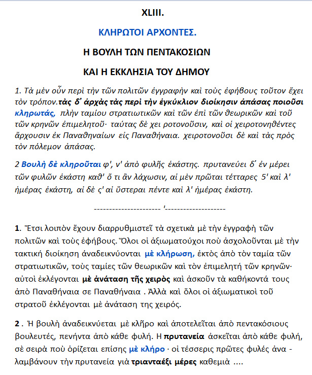 2. <<..ακρογωνιαίο λίθο της δημοκρατίας την ανάδειξη ηγετών με κλήρωση -έχει γράψει κι ο Αριστοτέλης κάτι {;} θαρρώ. >>