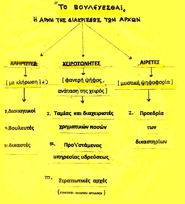 Κληρωτοί άρχοντες , η Βουλή των Πεντακοσίων , η Εκκλησία του Δήμου . Οι βουλευτές αναδεικνύονται στα αξιώματα δια ΚΛΗΡΟΥ ,διότι μεταξύ ίσων επιβάλλεται η κλήρωση .Στην Δημοκρατία της ισότητας επιλέγονται δια ΚΛΗΡΟΥ οι ικανοί * πολίτες .Όλοι ,εάν διαθέτουν » ΔΙΚΗΝ ΤΕ ΚΑΙ ΑΙΔΩ , ‘‘{ Πρωταγόρας } είναι ίσοι και άξιοι ,άρα μπορούν να συμμετέχουν στην άσκηση της δημοσίας εξουσίας. Στην Αριστοκρατία { ουσιαστικά ήταν η εκτροπή αυτής , η ολιγαρχία } της ανισότητας αναζητούνται οι άριστοι {= η αριστεία / ολιγαρχία του πλούτου } των πολιτών και όχι οι αίσχιστοι{=πένητες } , γι’ αυτό και επιλέγονται δια ΨΗΦΟΥ .