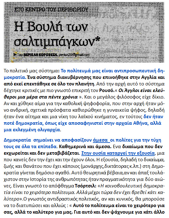 ΠΕΡ. ΚΟΡΟΒΕΣΗ – << H Βουλή των σαλτιμπάγκων >> Η αντιπροσωπευτική δημοκρατία ,[ κατ’ευφημισμόν δημοκρατία ] επινοήθηκε από τους αποικιοκράτες Εγγλέζους και επεκτάθηκε σ’όλο τον κόσμο.ΔΕΝ ΗΤΑΝ ΠΟΤΕ ΔΗΜΟΚΡΑΤΙΑ αλλά μια ΕΚΛΕΓΜΕΝΗ { δια ψήφου } ΟΛΙΓΑΡΧΙΑ..Ήρθαν δηλαδή οι Βρεττανοί να διδάξουν δημοκρατία στην Ελλάδα .! Έλα δημοκρατία στον τόπο σου ..δηλαδή. Κι από τον πολύ Αγγλικό σανό γινήκαμε χορτοφάγοι.! Διότι η πραγματική και Μία Δημοκρατία ΔΕΝ έχει αντιπροσώπους αλλά έχει Προσωπική συμμετοχή στην λήψη των αποφάσεων .Δεν εκχωρεί σε κανέναν [ ούτε στους αρίστους ] το δικαίωμα να αποφασίζει αντ’αυτού. Διότι είναι υποτιμητικό και δουλοπρεπές .Το άκρον άωτον δε της ειρωνείας , είναι το απόφθεγμα του κυνικού και ραδιούργου Τσώρτσιλ {με τις ..χαρτοπετσέτες} : << Η κοινοβουλευτική δημοκρατία είναι το χειρότερο πολίτευμα [ ενν. την Ολιγαρχία ] αλλά μέχρι τώρα δεν έχει βρεθεί κάτι…καλύτερο.>.!! Χα.! Βαφτίζει το κρέας ψάρι σαν τους ψευτοκαλόγερους. Τι εννοεί ο ποιητής ; Το γράφει πολύ εύστοχα ο Π. Κοροβέσης : << Aυτό το πολίτευμα είναι το χειρότερο για σας , αλλά το καλύτερο για μας. Γι αυτό δεν ψάχνουμε για κάτι άλλο .>> !!