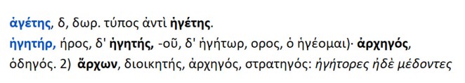 Ο ηγέτης / αγέτης / ηγητήρ { άγω } = αρχηγός , οδηγός , στρατηγός .Ο Ηγέτης του λαού [ λαγέτης] στην Αθηνα’ι’κή Δημοκρατία , ήταν ο Στρατηγός Περικλής [ ενός ανδρός αρχή με την συγκατάθεση βεβαίως του δήμου ].Οι Δέκα στρατηγοί στην Αθηνα’ι’κή δημοκρατία ΔΕΝ αναδεικνύονταν με κλήρωση αλλά με φανερή ψηφοφορία{ χειροτονητές αρχές }.