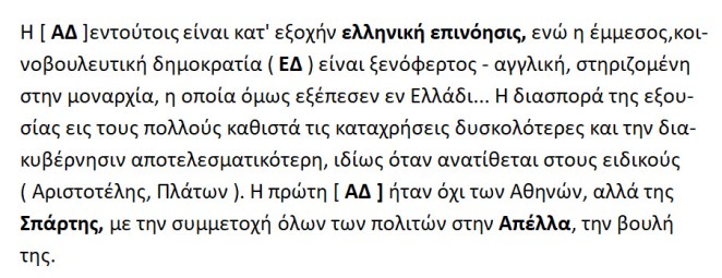 << Η άμεσος δημοκρατία είναι ελληνική επινόηση , ενώ η έμμεσος ξενόφερτη -Αγγλική , στηριζόμενη στην μοναρχία.! Η διασπορά της εξουσίας σε πολλούς καθιστά τις καταχρήσεις { λαμογιές } δυσκολότερες. Η πρώτη Άμεσος Δημοκρατία ήταν της Σπάρτης και όχι των Αθηνών ! { εκπληκτικός ερευνητής ο Κ.Κόλμερ , ευρυμαθής και εμβριθής μελετητής }