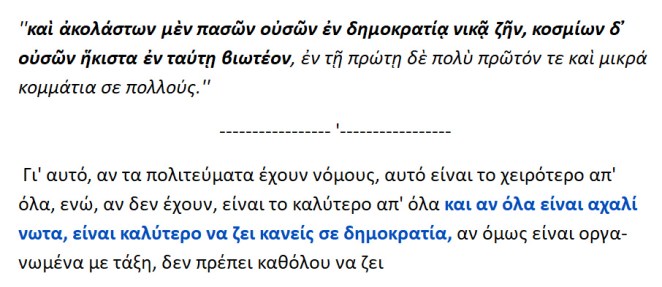 Η δημοκρατία εφαρμόζεται σε περιόδους παρακμής και ανομίας , όταν όλα είναι αχαλίνωτα και χαοτικά.