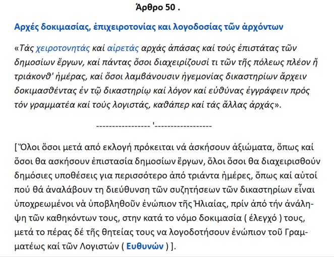 ΣΥΝΤΑΓΜΑΤΙΚΟΣ ΧΑΡΤΗΣ της ΑΘΗΝΑΙΩΝ ΠΟΛΙΤΕΙΑΣ , [ Άρθρο 50 ] . << Αρχές ΔΟΚΙΜΑΣΙΑΣ ,ΕΠΙΧΕΙΡΟΤΟΝΙΑΣ και ΛΟΓΟΔΟΣΙΑΣ των αρχόντων >>. » οι ικανοί πολίτες » = όχι όλοι , διότι πριν την ανάληψη των καθηκόντων ,υπήρχαν οι εξετάσεις των υποψηφίων .