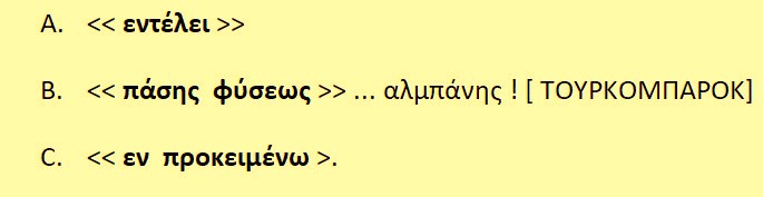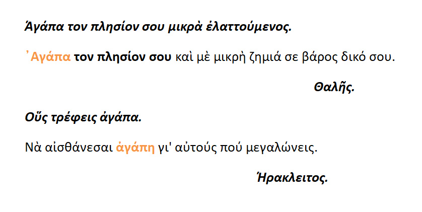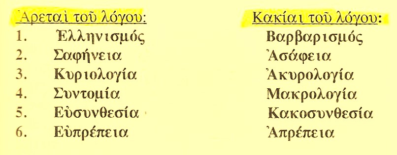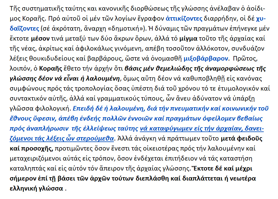 ΑΔ.KOΡΑΗΣ : << Βάσις μεν θεμελιώδης της αναμορφώσεως της γλώσσης δέον [πρέπον] να είναι η λαλουμένη .Επειδή δε η λαλουμένη ,δια την πνευματικήν και κοινωνικήν του έθνους ύφεσιν , απέβη ενδεής { φτωχή } πολλών εννοιών και πραγμάτων , οφείλομεν βεβαίως προς αναπλήρωσιν της ελλείψεως ταύτης να καταφύγωμεν εις την αρχαίαν , δανειζόμενοι τας λέξεις ων { των οποίων } στερούμεθα >>.