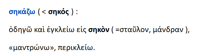Σηκάζω = οδηγώ και εγκλείω σε σηκό {= σταύλος , μαντρί }, μαντρώνω .