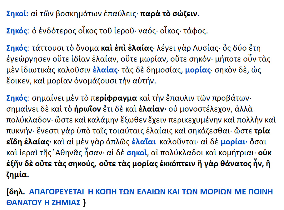 Σηκοί { < σώζειν } παρά το σώζειν . Σηκός = Οι επαύλεις των βοσκημάτων, το ενδότερο του ναού , ναός , οίκος , τάφος και επί ελαίας .{Τρία είδη ελαίας : 1. ελαία , 2. μορία 3.σηκός }.Περίφραγμα και έπαυλη των προβάτων .Δεν επιτρεπόταν να κόψουν τις μορίες και τις σηκούς, διότι η ποινή ήταν ή ο θάνατος ή η αποζημίωση .