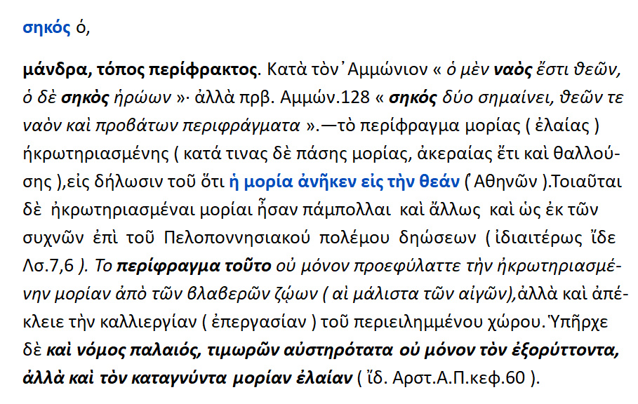 Σηκός = μάνδρα , τόπος περίφρακτος , είτε ναού είτε προβάτων είτε περίφραγμα μορίας [ελαίας ] εις δήλωσιν , ότι η μορία ανήκε στη θεά Αθηνά .