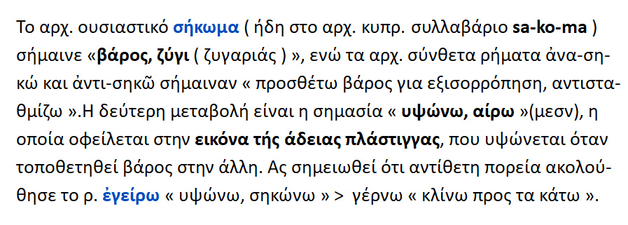 Σήκωμα = βάρος ,ζύγι. Σηκώνω : 1.Ζυγίζω ,αντισταθμίζω 2.Υψώνω ,αίρω [ μεσν.] η οποία οφείλεται στην εικόνα της άδειας πλάστιγγας ,που υψώνεται όταν τοποθετηθεί βάρος στην άλλη.