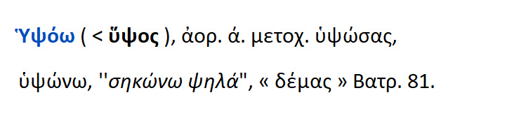 Υψόω-ώ { < ύψος < ύψι } = υψώνω , σηκώνω ψηλά .
