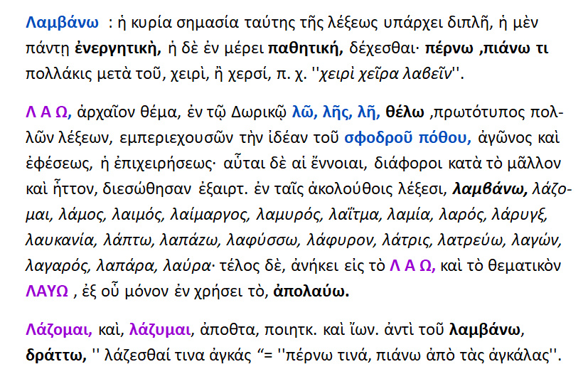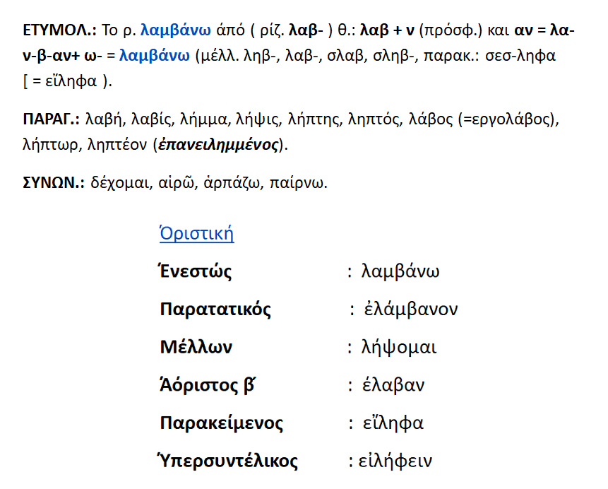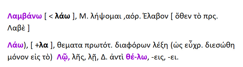 Λαμβάνω { < λάω } .Λάω {< λα } θεματικό πρωτότυπο διαφόρων λέξεων = θέ-λω