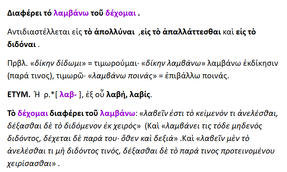 Διαφέρει το ‘λαμβάνω’ του ‘δέχομαι’ . Λαμβάνω κάτι , το οποίο κανείς δεν μου το έδωσε . Δέχομαι κάτι [ > δεξιά ] , το οποίο μου το δίνει κάποιο χέρι.