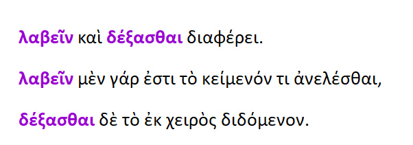 Λαβείν { αυτό που βρίσκεται κοντά και το πιάνεις με το χέρι } και δέξασθαι { αυτό που παίρνεις από χέρι το οποίο στο δίνει } διαφέρει.