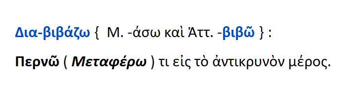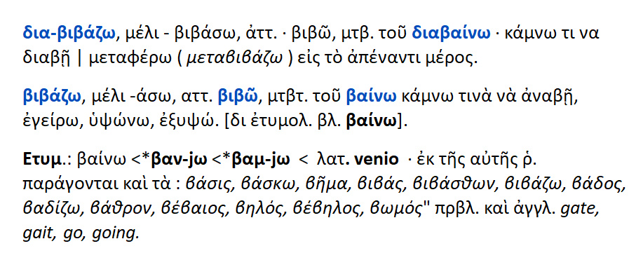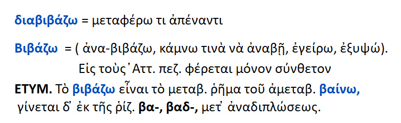 Βιβάζω { μεταβατικό του βαίνω } =κάνω κάτι να αναβή , εγείρω ,υψώνω . Διαβιβάζω { μεταβατικό του διαβαίνω } = κάνω κάτι να διαβή , μεταφέρω [μεταβιβάζω ] στο απέναντι μέρος. Βαίνω [ παράγωγα ] : βάσις , βήμα ,βιβάζω ,βαδίζω ,βάθρο , βέβαιος ,βηλός , βέβηλος , βωμός.