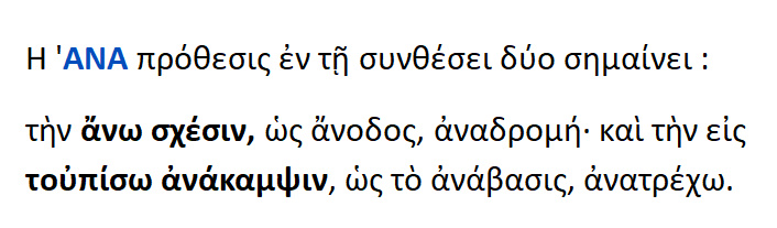 Η πρόθεση [ ΑΝΑ- ] στις σύνθετες λέξεις σημαίνει δύο πράγματα. 1.Την ΑΝΩ σχέση { άνοδος , αναδρομή } 2.Την προς τα ΠΙΣΩ ανάκαμψη { ανάβαση , ανατρέχω}.