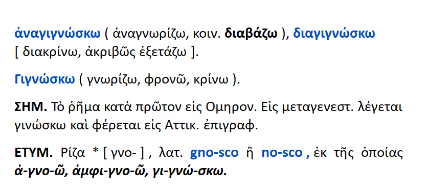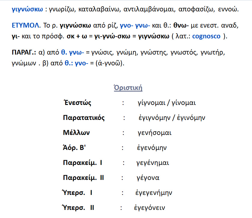 Γιγνώσκω = γνωρίζω , καταλαβαίνω ,αντιλαμβάνομαι,αποφασίζω,εννοώ. Το ρήμα έχει δύο ρίζες. Α} ριζ. ΓΝΩ– ,γνώσις , γνώμη ,γνώστης,γνώμων Β} ριζ. ΓΝΟ- , αγνοώ. Λατ.Cognosco { co-gno-sco }.