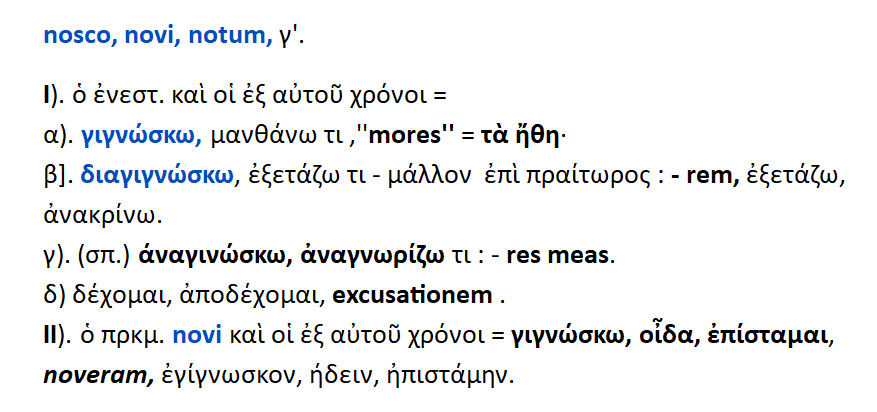 Nosco = 1.γιγνώσκω , διαγιγνώσκω ,αναγνωρίζω, δέχομαι 2.γιγνώσκω, οίδα,επίσταμαι .