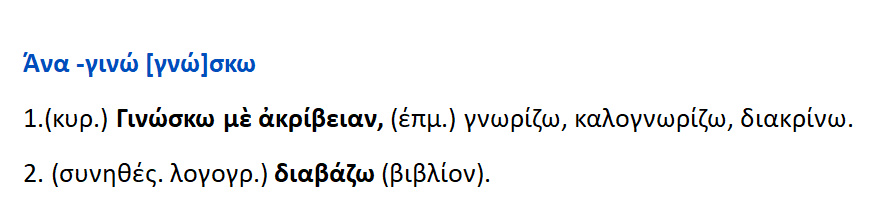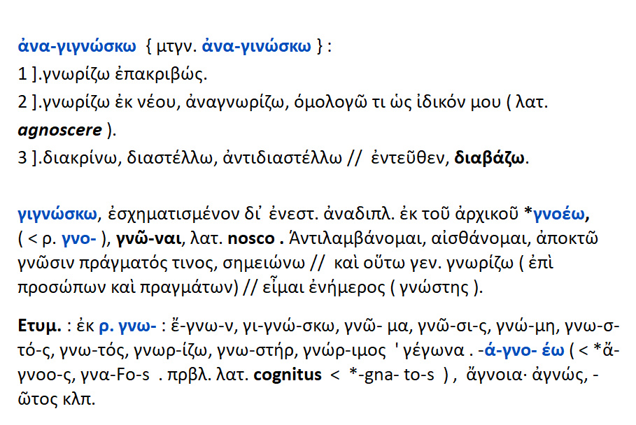 Ανα-γιγνώσκω = αναγνωρίζω ,διαβάζω [κοινώς].Γιγνώσκω= γνωρίζω ,φρονώ ,κρίνω. Το γινώσκω είναι μεταγενέστερο του γιγνώσκω. Από ρίζα *{ΓΝΟ- } > Λατινικά { γνω-} gno-sco ή nosco.