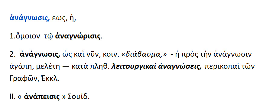 Ανάγνωσις =1. αναγνώρισις 2.ανάγνωση ,κοινώς διάβασμα.
