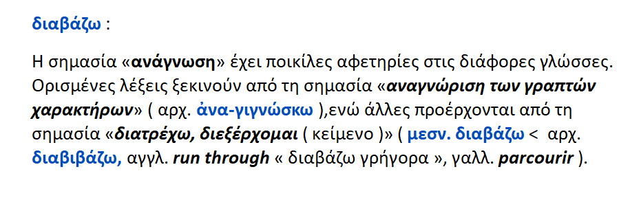 Διαβάζω = δια των οφθαλμών διαβαίνω επί των γεγραμμένων λέξεων .