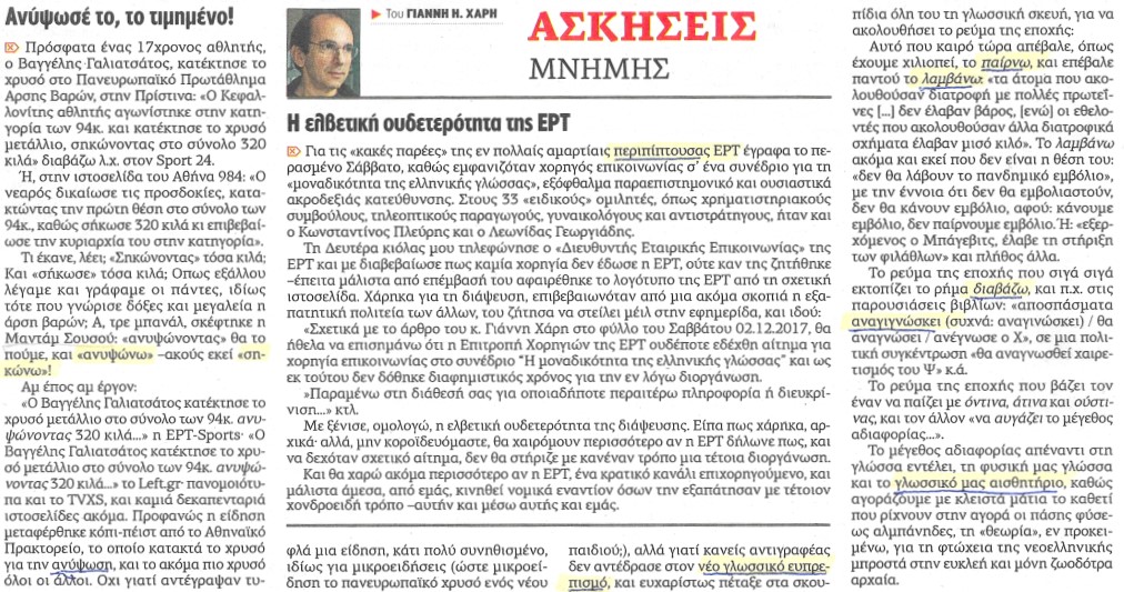 Επίλογος με το τροπάριο της Κασσιανής – ολίγον αλλοιωμένον – από τον πολυπράγμονα κ.Χάρη.: << η εν πολλαίς αμαρτίαις περιπίπτουσα ΕΡΤ >> . Κενταυρική σύνθεση.! Στην περίπτωση , που θα αλλάξει ο χρόνος της μετοχής , το ‘ περιπεσούσης‘ γίνεται ‘περιπιπτούσης ‘ κι ΟΧΙ περιπίπτουσας { για όσους σέβονται και δεν κακοποιούν την Ελληνική γλώσσα κατά το δοκούν }.