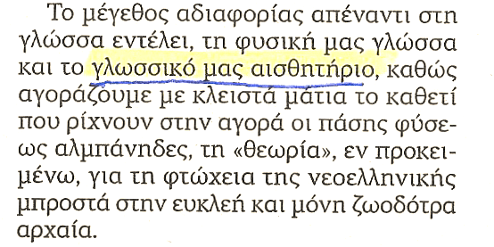 Tί έκαναν αυτοί οι νέοι ‘γλωσσικοί »ευπρεπιστές » ; Αντικατέστησαν κάποιες λέξεις της Δημοτικής με άλλες καθαρευουσιάνικες – κατά τον αρθρογράφο- και χαλάσανε << την φυσική μας γλώσσα και το γλωσσικό αισθητήριο >>. Μάλιστα ! Δυστυχώς δεν θα μπορεί πλέον η φυσική μας γλώσσα να ξεχωρίσει το γλυκό , το πικρό , το αλμυρό και το ξινό .Ίσως δε [ το απεύχομαι ] μετά την πάροδο ετών να έχουμε χρεία τεχνητής γλώσσας.!